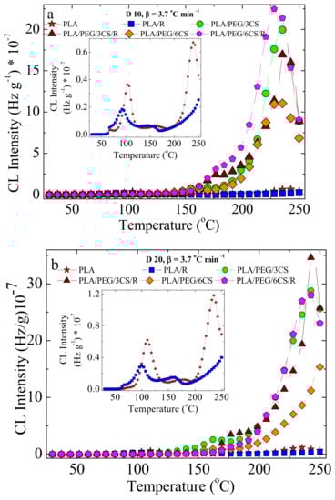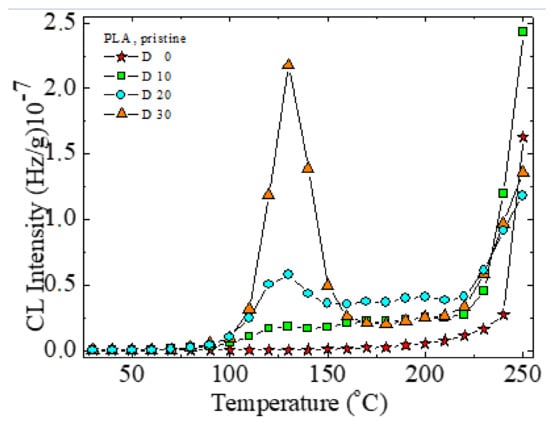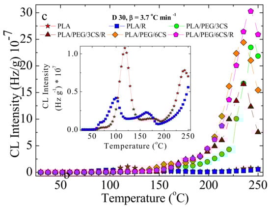 The addition of phenolic antioxidants such as rosemary extract powder usually increases the thermal and radiation stabilities by scavenging degradation precursors [67]. The contribution revealed by the components of this natural stabilizing mixture is described by means of the differences between the CL intensities recorded for stabilized systems.