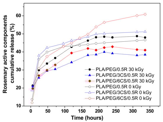 The polyethylene glycol (PEG)-plasticized PLA/chitosan/powdered rosemary extract biocomposites of various compositions (3 wt% CS or 6 wt% CS) irradiated at dose of 30 kGy were studied in terms of migration kinetics in conditions that mimic storage at ambient temperature for unlimited duration, as for a minimum of 10 days (14 days) at 40 °C, using a 50% aqueous ethanol (v/v) solution as modified D1 food simulant [35]. This is considered the most severe aqueous food simulant for dairy products and alcohol containing foods [36]. Detailed descriptions of the experimental procedure and kinetic interpretation of the data can be found in [25,26]. Concentrations of the released active components were calculated based on the calibration curves performed for the main active components of rosemary extract as previously determined [25,26] and according to the literature data [37,38,39].