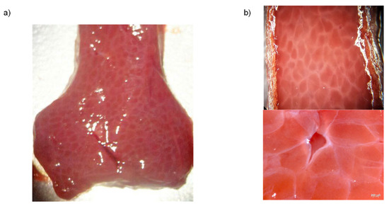 Porcine liver sample showing the histological composition of the tissue: (a) Microscopic view of the tissue sample showing its heterogeneous composition; (b) Parenchyma cells and fibers structures in a microscopic view of a porcine liver tissue sample, showing the histological composition.