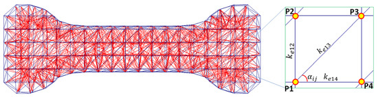 During implementation of the SMM for predicting the response of biological tissue in real-time [12,13], each organ is considered as a construction of mass points and springs, as shown in Figure 1. In this approach, the non-linearity that exhibits soft tissue is obtained by a random combination of the material stiffness assembled with an internal skeleton structure that provided variable stiffness. To calculate the force Fi at a point Pi in the mesh shown in Figure 1, Hooke’s law is used to determine the force of a linear spring that connects Pi with Pj considering the stiffness kij, the initial spring length Lij, and the current spring length at the time of the calculation, using the following expression [13]: