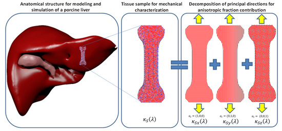 By using this method, one can find the parameters of a simplified model that allows real-time simulation using the mechanical properties of soft tissue organs collected from uniaxial extension tests. In addition, notice that all the above energy density expressions can be computed by considering the principal stretch fibers direction and those fiber families oriented at 55°, and described by (1,1,1) (and all variations (−1,1,1), (1,−1,1), (1,1,−1), and so on). See [6,7], and references cited therein. Further, we assume that the contribution of the material fibers have random distribution along the principal axes, and that the properties obtained are distributed based on the fiber main orientation. The EESM formulation for uniaxial tension considers that the contribution of the stiffness in the principal directions is the one described in the model and used to predict its mechanical behavior, as shown in Figure 4.