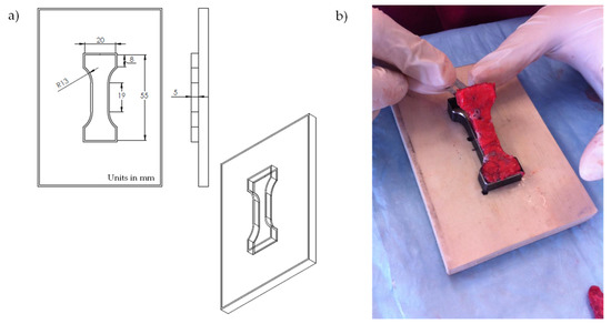 Liver sample preparation to carry out uniaxial loading and unloading cyclic tensile tests. (a) Tooling dimensions for cutting liver fresh samples. (b) Liver sample geometry.