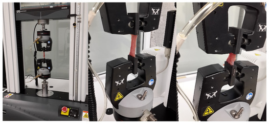 To collect experimental data needed to compute the stiffness values of the EESM elements given by Equation (11), we performed cyclic loading and unloading uniaxial extension test on porcine liver parenchyma samples. All uniaxial tests were performed in an Instron 3365 electromechanical universal testing machine with load cell of 5 kN, and movable crosshead velocity of 0.01 mm/s, as illustrated in Figure 6. Destructive tests were carried out to identify the liver tissue maximum elongation at break. Then, three loading and unloading cycles were set at different elongation stretch values, as shown in Figure 7.