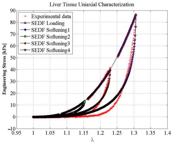 To address the accuracy attained from our proposed hybrid material model, we use uniaxial loading and unloading experimental data collected from porcine liver samples [49]. Figure 11 shows the predicted loading and unloading engineering stress curves obtained from Equations (18) and (19). One can see from Figure 11, that the material model based on the equivalent SEDF captures experimental data well. In this case, the material constants used to fit experimental data were: µ = 0.1 kPa, N = 1.1974, b = 3.3389, A1 = 9.6754 kPa, A2 = 7543.6 kPa. C = 9.5273 kPa, and f = 0.2755. To find the stiffness function of an EESM element, the SEDF is computed using Equation (9) with m2.