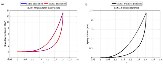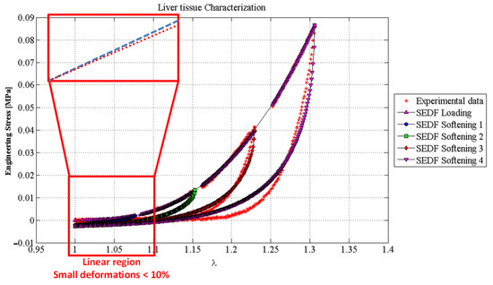 Figure 13 shows the experimental data and the SEDF predictions compared to the SMM and EESM element predictions using the computed stiffness values. Both models were evaluated under the same conditions, using the same software and hardware, and estimating the best fitting stiffness parameter values to represent the material stress-stretch behavior. Notice that the EESM proposed approach predicts the soft tissue nonlinear behavior and the Mullins effects well.