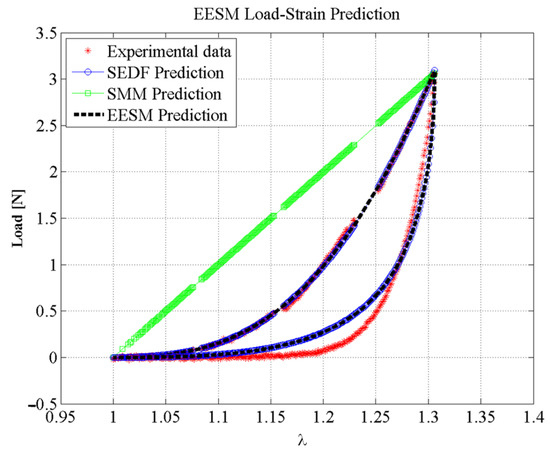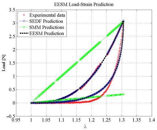Comparison of the load-strain predictions obtained using the SMM versus the EESM, demonstrating that the EESM formulation can represent the behavior of soft tissue and biological materials in large deformation, including characterization of the nonlinear behavior and the Mullin’s effect.