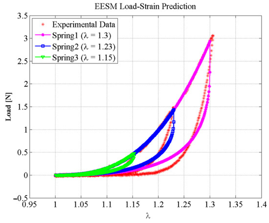 In addition, three springs with different initial and final lengths (called Spring1, Spring2, and Spring3) were used to run some numerical tests. Spring1, Spring2, and Spring3 were elements subjected to the maximum stretch value of respectively. Predictions obtained from these springs are shown in Figure 14. Notice that theoretical predictions and experimental data agree well, which is an indication of the accuracy achieved from our proposed approach.