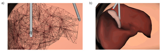 Real-time simulation of mechanical behavior of a liver geometry using EESM elements: (a) Internal mesh of one-dimensional elements representing springs with variable stiffness in function of the constitutive model; (b) shaded visualization of the deformation mesh calculated on real-time with 31 fps.
