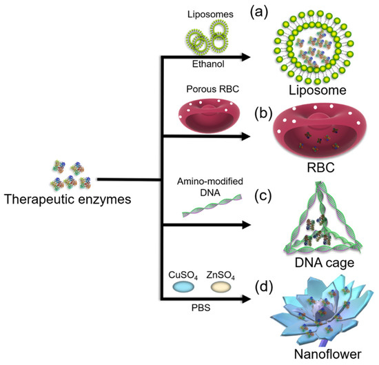 Illustration of entrapment approaches for therapeutic enzyme immobilization using (a) liposomes, (b) red blood cells (RBCs), (c) DNA cages, and (d) metal–protein hybrids (nanoflowers). Here, PBS denotes phosphate-buffered saline.