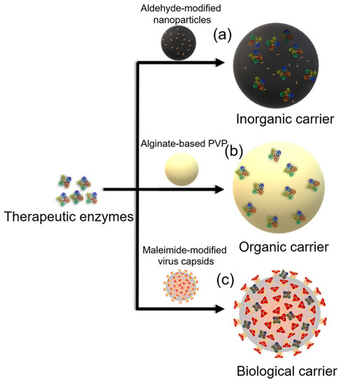 Owing to their high activity, unique selectivity for target substrates, and catalytic capabilities, enzymes are more advantageous than traditional drugs [5]. Although there are a number of enzymes that could potentially be applied in clinical medicine, only a small amount can be used because of the body’s capacity to develop defensive responses to extraneous proteins, which results in their rapid clearance [6]. As proteins, enzymes are costly and also easily degraded because of their large size and limited distribution within the host [7]. To protect therapeutic enzymes from degradation, scientists have attempted to modify or immobilize enzymes. Immobilization is an important strategy for stabilizing enzymes, especially for the delivery of therapeutic enzymes. In the present review, the various immobilization methods developed for therapeutic enzymes are discussed and summarized.