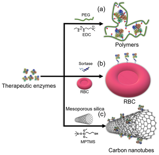 Illustration of covalent approaches for therapeutic enzyme immobilization via conjugation onto (a) polyethylene glycol (PEG), (b) red blood cells (RBC), and (c) mesoporous silica. Here, EDC and MPTMS denote 1-ethyl-3-(3-dimethyl aminopropyl)carbodiimide and mercaptopropyltrimethoxysilane, respectively.