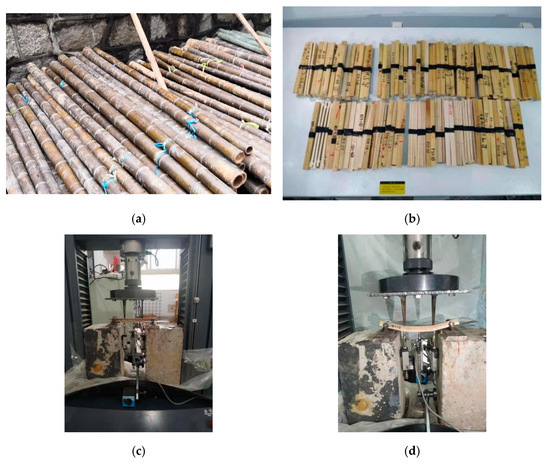 The four-point method was used for loading (Figure 1c). The two loading points are each 50 mm away from the center line of the support, and the distance between the loading points is 80 mm ± 1 mm. The specimens were placed on two supports of the test apparatus. Three dial indicators are installed on the base of the testing machine to measure the deflection of the two loading points and the middle of the span. The test loading rate was 150 N/mm2 per minute. The calculation formulas of bending strength and elastic modulus are as [23]: