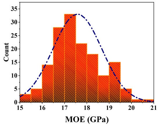 Bending elastic modulus is usually used as the classification index of materials. The distribution of MOE is shown in Figure 3. It can be seen from Figure 3 that the distribution of MOE conforms to the characteristics of the normal distribution, and the data is mainly concentrated between 16.5 GPa and 18.5 GPa. Therefore, based on the stability of MOE distribution, MOE can be used as an index to evaluate mechanical properties in the performance evaluation system of P. edulis bamboo. Based on the above analysis, the bending elastic modulus of moso bamboo is divided into three grades (grade I, grade II, and grade III), and the classification results are shown in Table 1. The range less than 16.5 GPa is regarded as grade I, the range not less than 16.5 GPa and less than 18.5 GPa is regarded as grade II, and the range larger than 18.5 GPa is classified as grade III. The mean values of MOE of grade I, grade II, and grade III are 15.90 GPa, 17.41 GPa, and 19.22 GPa, respectively. Grade II is 9.48% higher than grade I, and grade III is 10.43% higher than grade II. The proportions of grade I, grade II, and grade III are 14.19, 65.16, and 20.65%, respectively, of which the sum of the proportions of grade II and grade III exceeds 80%. Literature [25] also adopted the above method for classification. Through the classification of grades, the efficient use of P. edulis bamboo resources can be realized.