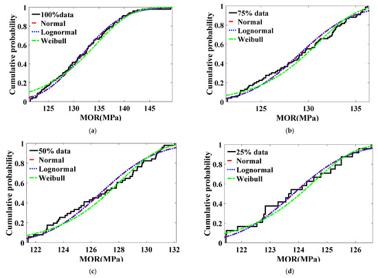 The tail cumulative probability density has an important influence on reliability [26]. Figure 4 shows the fitting results of the cumulative probability of bending strength of grade II bamboo under different probability distributions. As can be seen from Figure 4, when the cumulative probability density is lower than 0.25, the curve obtained by fitting normal distribution and lognormal distribution is relatively close, and the curve obtained by fitting Weibull distribution is higher than that obtained by normal distribution and lognormal distribution. The difference of curves obtained by fitting 100% data points with three distribution models is the largest, and the difference of 75, 50, and 25% data points is reduced.