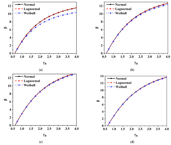 The relationship between β and γR under different load types and load ratios (grade II): (a) D + R; (b) D + O; (c) D + W; (d) D + S.