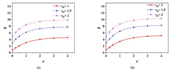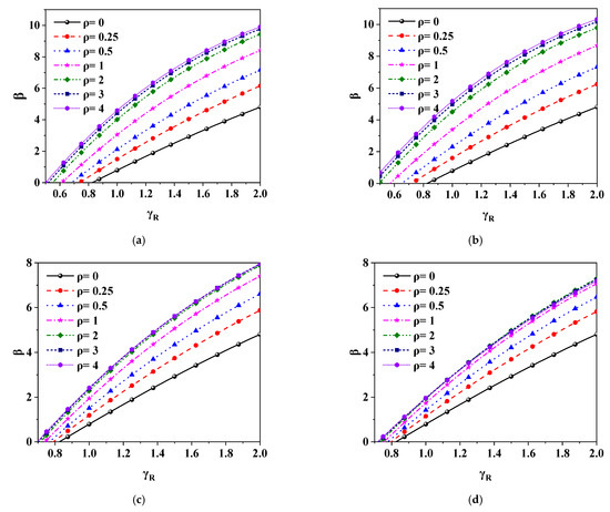 In reliability analysis, four load combinations are considered, which are constant load + live load of residential floor (D + R), constant load + live load of office floor (D + O), constant load + wind load (D + W) and constant load + snow load (D + S). The return periods of wind load and snow load are 30 years and 50 years, respectively [27,28]. Seven load ratios (ratio of variable load to permanent load) are considered, which are 0, 0.25, 0.5, 1.0, 2.0, 3.0 and 4.0 respectively. The structural safety grade shall be considered as level 2, and the design base year shall be considered as 50 years. Figure 7 is the relationship curve between β and γR of grade II data under different load types and load ratios, and Figure 8 is the relationship curve between β and ρ of grade II data under different load types and partial factors for resistance. It can be seen from Figure 7 that β increases with the increase of γR, and the slope of the curve gradually decreases. It can be seen from Figure 8 that β increases with the increase of ρ, and the slope of the curve gradually slows down with the increase of ρ. The above analysis results are consistent with the literature [22,26,29]. According to Formula (8), when ρ and other parameters are constant, the relationship between β and γR is positively correlated with slope decline, which is consistent with the results shown in the curve. When γR and other parameters are constant, the relationship between β and ρ is also positively correlated with slope decline, which is consistent with the results in Figure 8.