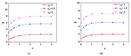 The relationship between β and ρ under different load types and partial factors for resistance (grade II): (a) D + R; (b) D + O; (c) D + W; (d) D + S.