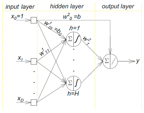 where y (x; w) is the model response, x is the input vector, w is the vector of the free parameters (weights and biases), H is the number of neurons in the hidden layer, g is the activation function in the hidden layer, D is the input number, 1 and 2 are the numbers of layers, h = 1 − H, j = 1 − D and w0j and w0 are the bias parameters for the first and second layers, respectively. The architecture of this kind of neural network is depicted in Figure 2.