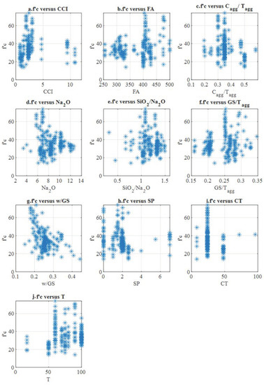 In the experimental determination of the ultimate compressive strength of the geopolymer concrete (as is the case for ordinary Portland cement concrete), the shape and size of the test specimens (cubes or cylinders), as well as the boundary conditions and speed of the test, influenced the results obtained [7]. Therefore, all the compressive strength values of cubes from the literature were converted into the corresponding cylindrical compressive strength values according to [47]. Thus, the cylindrical compressive strength at 28 days of age (f’c in MPa) represents the output variable in this study. The raw data with their equivalents can be seen in Table S1 in the Supplementary Materials of this article. The dataset with ten input variables and the output variable is shown in Table S2 of the Supplementary Materials. Statistical parameters such as the range, mean, median and standard deviation of the dataset were calculated and are presented in Table 1. Figure 3 illustrates the relationship between the output variable (the dependent variable, f’c) and each input variable (the independent variables). Almost none of the dependent variables showed a clear trend with the independent variables except for the w/GS variable, indicating that increasing the w/GS ratio decreases the compressive strength. This tendency may indicate that w/GS is the most crucial factor affecting FA-based geopolymer concrete. This finding agrees with the results of [21]. The ten input variables of the model are listed in Table 1.