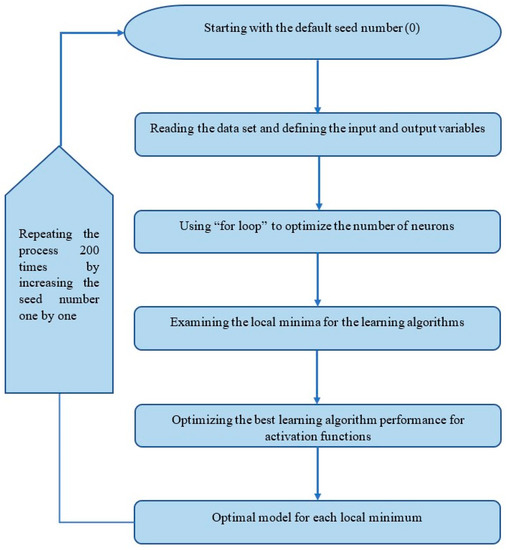Through the definition of the FLNN, the optimisation process is governed by the number of hidden units (neurons), the choice of the learning algorithms and the choice of the activation function. In the optimisation process, 12 learning algorithms (trainrp, trainlm, traincgp, traincgb, trainbfg, trainos, traincgf and traingda) and eight activation functions (tansig, radbas, poslin, elliotsig, elliot2sig, softmax, logsig and satlin) already built into the Matlab software [24] were used for developing the code. The flowchart in Figure 4 shows the development steps of the Matlab code optimisation process, which consisted of the following: