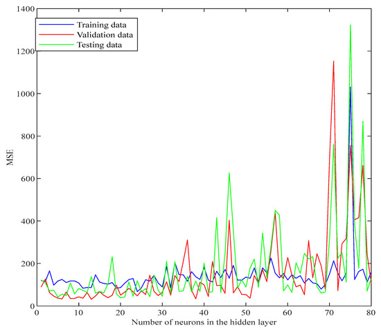 - Optimising the number of neurons: The number of hidden neurons was changed from 1 to 80. For each FLNN with a specific number of hidden neurons, the MSE was calculated for the training, validation and testing subsets. This was carried out by generating a for-loop considering the number of hidden neurons, which varied from 1 to 80. The solution was evaluated through the cross-validation technique by plotting the MSE versus the number of hidden neurons [20,50]. The MSE converged at the local and global minima, which was a topic of interest to be investigated in the subsequent steps. Figure 5 shows the convergence and divergence of MSE versus the number of neurons in the hidden layer.