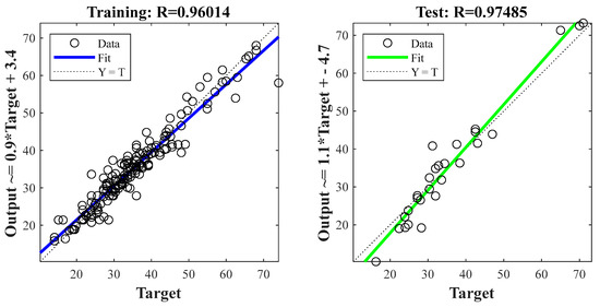 In the first step of the optimisation, the Matlab code was run 201 times by changing S (0–200). The local and global minima were investigated each time by selecting the corresponding hidden neurons. After that, the learning algorithm and activation function choices were examined to determine the optimal model. The best performance was achieved when the default seed number (S = 0) was applied. The results of S = 0 are presented in Table 2. The selection criteria of the optimal model were the number of hidden neurons (H), the learning algorithm (LA) type and the activation function (AF) type, based on the MSE function and the R between the model output and the actual output. The analysis showed that the best performance was found for Model No. 4. The architecture of Model No. 4 consists of seven hidden neurons, a trainbr learning algorithm and a tansing activation function [16,24]. As mentioned earlier, the trainbr algorithm does not require validation subsets. Therefore, the validation subset ratio was set to zero, and the performance parameters (MSE and R) were evaluated for only the training and testing subsets. The MSE values were 10.4 and 15.0 for the training and testing subsets, respectively. The root mean squared error (RMSE) values were calculated by taking the root of the MSE values, thus giving ±3.22 MPa and ±3.87 MPa, respectively. As shown in Figure 6, the R values were 96.0% and 97.5% for the training and testing subsets, respectively.