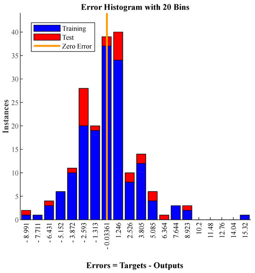 Since the RMSE value was ±3.87 MPa for the testing data (data that were unseen in the training process), the optimal model could be generalised for future data with an average error of ±3.87 MPa. Figure 7 demonstrates that the error of the optimal model is normally distributed, and most of the data have an error value equal to or less than the RMSE (±3.87 MPa). Since the RMSE follows a normal distribution, the probability can be calculated from the Gaussian probability tables [25]. By applying the z probability table, for z = ±3.87, the corresponding probability value is 99.995%. This means that the probability of the optimal model would be 99.995% in the [−3.87, 3.87] interval for future data. Therefore, the performance of the optimal model is excellent compared with the results of other machine learning methods in the peer-reviewed literature.