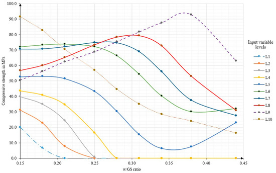 Compressive strength (f’c) vs. the water–geopolymer solid (w/GS) ratio for the ten levels of the input variables (L1–L10).