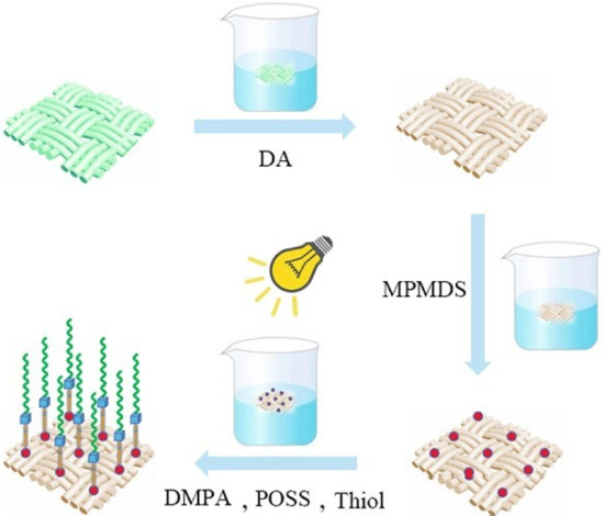 The nylon 56/cotton-interwoven fabric was purchased from Jiangsu Lianfa Textile Co., Ltd. (Nantong, China) (containing 50% nylon 56 fiber and 50% cotton fiber). Dopamine hydrochloride (98.5%) (DA) (AR) was purchased from Shanghai Yuanye Biotechnology Co., Ltd. (Shanghai, China). Tris(hydroxymethyl)aminomethane and hexadecyl mercaptan were purchased from Shanghai Jingchun Biochemical Technology Co., Ltd. Mercaptopropylmethyldimethoxysilane (97%) (MPMDS) was purchased from Shanghai Saen Chemical Technology Co., Ltd. (Shanghai, China). Eight vinyl-POSS were purchased from Shanghai Aladdin Biochemical Technology Co., Ltd. (Shanghai, China). Tris Hydrochloride was purchased from Suzhou Great Pharmaceutical Technology Co., Ltd. (Suzhou, China). 2,2-Dimethoxy-2-phenylacetophenone (DMPA), absolute ethanol, ethyl acetate, oil red O, methyl blue, reactive blue 4 dye, dichloromethane, carbon tetrachloride, and ethyl acetate were purchased from China Sinopharm Chemical Reagent Co., Ltd. (Shanghai, China).
