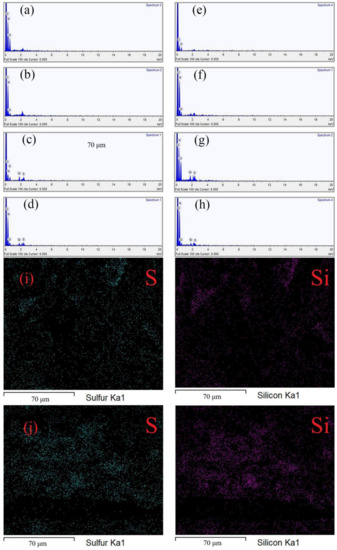 Figure 3 shows the EDS energy spectrum of nylon 56 fiber and cotton fiber before and after finishing, respectively. Table 1 lists the element contents. Table 1 compares the C, O, and N element content ratio on the dopamine-modified nylon 56 fiber to that in Table 1, which has significantly changed. The presence of N in cotton fiber in Table 1 indicates that polydopamine has been successfully coated on the fiber surface. The appearance of S and Si in Table 1 demonstrates that mercaptosilane successfully hydrolyzes and adheres to the fabric. Furthermore, the S and Si content of nylon 56 fiber and cotton fiber has changed (Table 1). The click chemical reaction has been successful, indicating that POSS and mercaptans have been grafted to the fiber, thus showing super-hydrophobicity on the fabric surface. Figure 3i,j shows the distribution of S and Si on the surface of the modified fabric; the elements were evenly distributed.