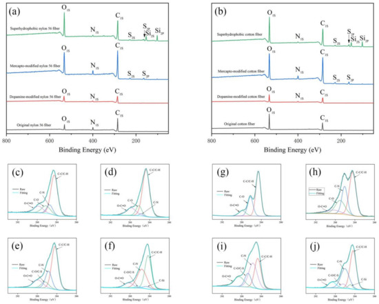 (a) XPS spectra of the original nylon-56 fiber, dopamine-modified nylon-56 fiber, sulfhydryl-modified nylon 56 fiber, and superhydrophobic nylon-56 fiber; (b) XPS spectra of raw cotton fiber, dopamine-modified cotton fiber, sulfhydryl-modified cotton fiber and superhydrophobic cotton fiber. High-resolution C1s spectrum of original nylon-56 fiber (c), dopamine-modified nylon-56 fiber (d), sulfhydryl-modified nylon 56 fiber (e), superhydrophobic nylon-56 fiber (f); raw cotton fiber (g), dopamine-modified cotton fiber (h), sulfhydryl-modified cotton fiber (i), superhydrophobic cotton fiber (j).