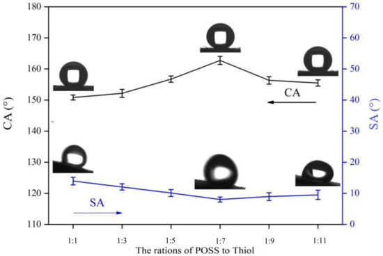 Changes in CA and SA with the ratio of octavinyl-POSS to cetyl mercaptan.