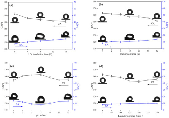 The changes in the CA and SA of superhydrophobic nylon-56/cotton-interwoven fabric under the following conditions: (a) UV irradiation over various times; (b) soaking in acetone over various times; (c) soaking in various pH solutions over 48 h; (d) washing over various times.
