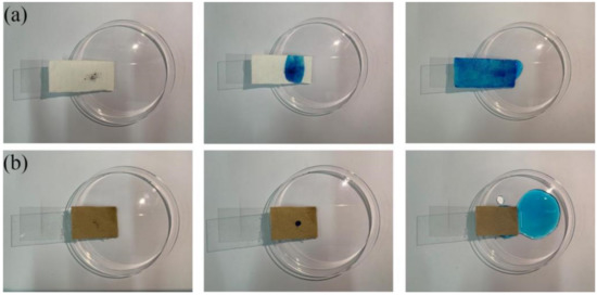 Self-cleaning test of fabric: (a) original fabric and (b) superhydrophobic fabric.