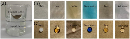 Superhydrophobic fabrics should have anti-fouling and self-cleaning properties. When contaminants contact the fabric’s surface, they should be easy to remove by washing them with water. As shown in Figure 8a,b, the blue dye did not move with the water droplets for the original fabric but spread to the entire fabric. However, the contaminants on the superhydrophobic fabric were easily taken away by the water droplets, thus leaving a clean surface. To confirm the water repellency of the superhydrophobic fabric, the original fabric and the superhydrophobic fabric were placed in water. The results demonstrated that the original fabric sank into the water while the superhydrophobic fabric was suspended on the water surface after being released (Figure 9a). Moreover, we conducted anti-fouling tests using saltwater, coffee, milk, dyed water, cola, and tea to explore the practicality of coated fabrics in daily life. As shown in Figure 9b,c, the original fabric was completely wetted by contamination; however, the droplets on the surface of the superhydrophobic fabric were spherical. These results confirm that the modified fabric exhibits excellent self-cleaning and anti-fouling properties.