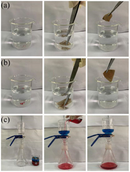 (a,b) The selective adsorption of superhydrophobic fabric to methylene chloride (dyed with oil red O) and carbon tetrachloride (dyed with oil red O) in water, (c) the oil–water separation test of superhydrophobic fabric.