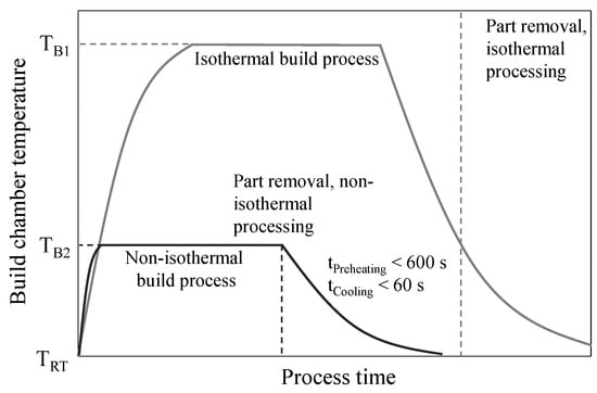 Resulting implications for process temperature control include significantly reduced pre-heating times and the immediate removal of manufactured parts subsequent to the build process. Reduced pre-heating times are obtained considering reduced requirements of the thermal homogeneity in contrast to quasi-isothermal processing, thus limiting the required homogenous thermal field to the thickness of the manufactured layer. Resulting process times of non-isothermal and quasi-isothermal processing, respectively, are displayed in Figure 2.
