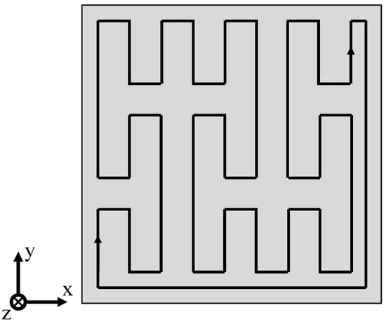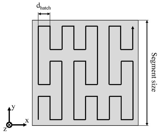 To allow for the non-isothermal processing of semi-crystalline polymers, restricting the distortion of exposed segments is essential. Based on previous research on the field of segmented exposure strategies [23,25], segmented exposure strategies are combined with the application of fractal scan paths [26,27,28,29] and quasi-simultaneous exposure of distinct segments. Fractal scan path generation applied within the present paper is based on space-filling, self-avoiding and self-similar curves, commonly referred to as “FASS curves” [30], specifically on the Peano curve [31]. The implementation of fractal, quasi-simultaneous exposure strategies is based on functional recursive programming, conducted in Python 3.8. Resulting exposure strategies are transferred using the Common Layer Interface (CLI) format to allow for the integration of complex exposure strategies into commercially available machinery. Exposure paths, applied for the non-isothermal processing of polymers, include discrete fractal sub-segments that are exposed using fractal sequencing. The resulting exposure strategy of an exemplary square cross-section is displayed in Figure 3.