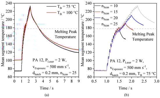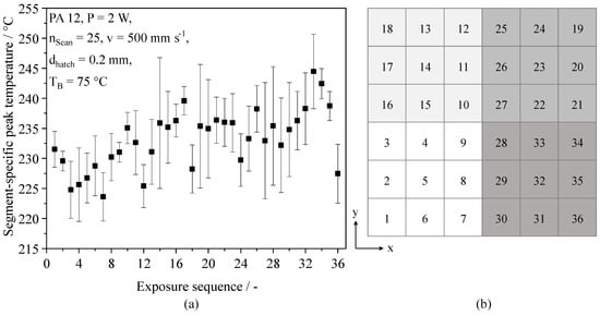 The thermographic investigation of quasi-simultaneous exposure at non-isothermal conditions displays a characteristic gradual increase of observed mean segment temperatures. An increasing number of consecutive scans is correlated with a degressive increase, displayed in Figure 7a. Considering emergent peak temperatures, the excess of superficial melting of the powder bed significantly depends on the number of consecutive scans, being correlated with the applied energy density. Considering a degressive thermal increase, a similar thermal evolution can be observed for isothermal exposure using the meander exposure strategy due to a thermal superposition of consecutively exposed scan paths [19,20]. The influence of the applied powder bed temperature is clearly displayed with regard to the cooling rate, indicating a negative correlation of the applied temperature and the cooling rate. However, no significant influence of the powder bed temperature on resulting peak temperatures is observed, indicating a superposing influence of the local powder bed morphology on measured peak temperatures. Varying numbers of applied consecutive scans of distinct segments exhibit a quasi-linear relation of the number of applied scans and resulting peak temperatures, shown in Figure 7b, thus enabling the adjustment of resulting peak temperatures.