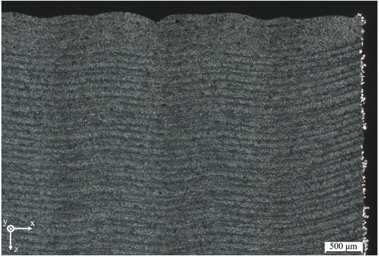 Non-isothermal, quasi-simultaneous PBF of Polyamide 12 exhibits considerable morphological differences compared to components processed by means of isothermal PBF. Thin sections of manufactured cubic samples display a layer-wise crystallization of distinct layers, exhibiting a parabolic melt pool geometry of exposed segments, displayed in Figure 9.