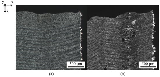 Polarization micrographs of cubic samples manufactured applying a powder bed temperature of 75 °C (a) and 100 °C (b).