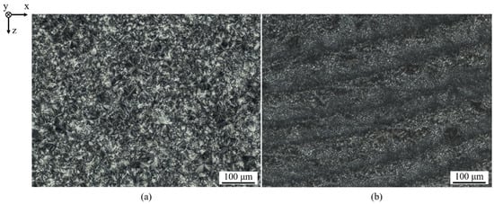 Polarization micrographs of Polyamide 12 specimens manufactured applying isothermal (TB = 170 °C, v = 2000 mm s−1, P = 16 W, dhatch = 0.2 mm) (a) and non-isothermal (TB = 75 °C, v = 500 mm s−1, P = 2 W, dhatch = 0.2 mm) (b) processing.