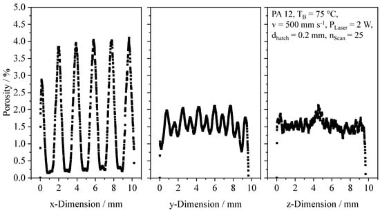 Using computed tomography, the occurrence of local thermal degradation is predominantly limited to the center of distinct segments. The formation of spherical pores can be correlated with excessive energy input into the melt pool, indicating a reduced level of optimum energy density. However, considering an overall density of 98.51% ±0.31, the satisfactory manufacturing of dense components can be demonstrated. Resulting spatial porosity distributions exhibit a periodic occurrence of thermal degradation within the build plane. In contrast, the average porosity level exhibits a predominant invariance towards the build height, displayed in Figure 12.