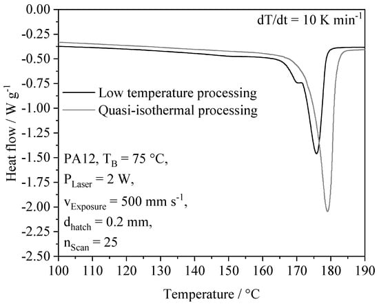 Using differential scanning calorimetry, similar properties of components manufactured using isothermal and non-isothermal PBF-LB/P can be observed. In contrast to the isothermal crystallization of Polyamide 12 at reduced ambient temperatures, described by Paolucci et al. [14], no exothermal peak, correlated with cold crystallization, can be observed for the application of a powder bed temperature of 75 °C, displayed in Figure 13. Displayed results are in good accordance with findings described by Zhao et al. [13], exhibiting a negative correlation of the applied cooling rate and the melting peak temperature of fabricated samples, determined by means of DSC.