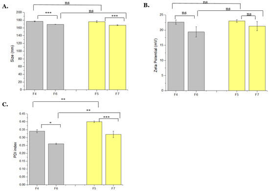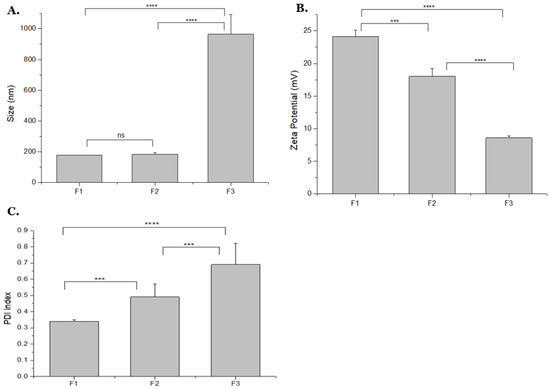 Figure 1A, changing the TPP volume from 0.5 to 1 mL did not reveal significant changes to particle size, maintaining the values at around 180 nm in samples F1 and F2. In the formulation F3, an increase of TPP volume to 2 mL, resulted in particle sizes of almost 1000 nm. The formation of aggregates/flocculation probably led to this increase, and clusters were also observed inside the solution. The same effect was obtained by Tzeyung and co-authors in their experiments, keeping the drug concentration of 0.05%, CS and TPP concentrations of 0.05%, and varying the TPP volume (5, 6, and 7 mL). An increase of 10 nm was observed from 5 to 6 mL of added TPP; however, upon increasing the volume to 7 mL a significant difference of 98 nm was noticed [