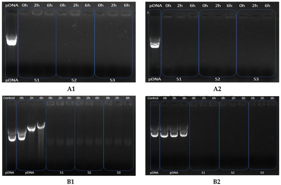 Figure 4B1. However, no free DNA is observed in the lanes where pDNA encapsulated in nanocarriers is tested. These results suggest that the CS-TPP-pDNA NPs remained stable in these incubation conditions and effectively protected the plasmid from degradation for at least 6 h. Similarly,