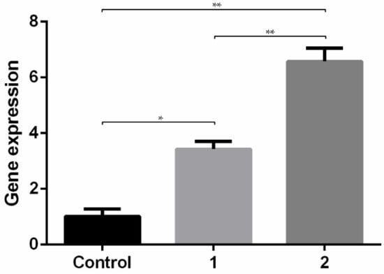 An RT-qPCR experiment was performed to quantify E7 mRNA expression levels. Considering this assay is more accurate and specific, it was applied to compare and evaluate the performance of two samples formulated with 60 μg/mL of pDNA but resultant from two different centrifugation speeds (6000 and 10,000 rpm) (