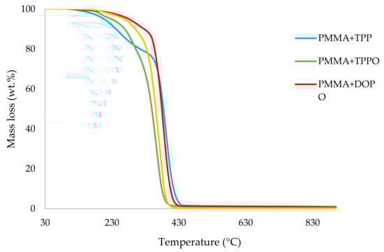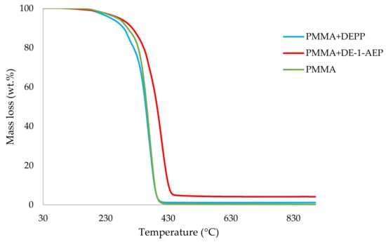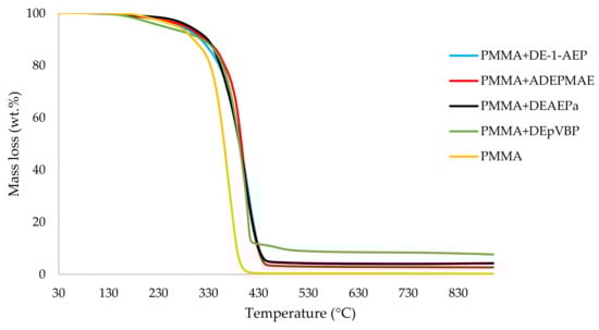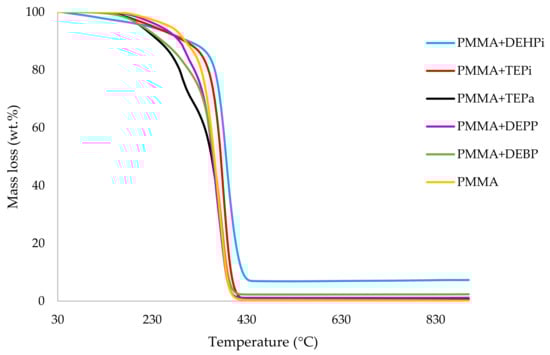 It can be noticed from the above table that the homopolymer (PMMA) has the highest temperature to initial mass loss (i.e., the induction point), followed by PMMA + TPPO. The corresponding value is least for PMMA + DEHPi (starting at 52 °C), which can be attributed to the release of some small molecules. However, this polymeric system produced the highest amount of char among the additives. On the other hand, PMMA + DEpVBP produced the maximum quantity of char among the reactives selected for the study. In addition, the reactively-modified systems generally exhibited relatively high thermal stabilities, in terms of the temperature at 50 wt% composition (almost 30 degrees higher compared to pure PMMA), than those systems containing the additives. This can be attributed to the interference of the acrylic co-monomeric unit with the unzipping reactions of sequential parts of the methacrylate units, thereby partially blocking the usual pathway of complete decomposition of the PMMA chains to yield the monomer [3]. Furthermore, thermal cracking of the pendent phosphorus-containing moieties has been shown to be responsible for the condensed-phase mechanism which results in char formation, through the initial formation of substituted phosphorus acids. Previous studies have already identified that reactive compounds are generally more effective than additives [3,30]. Generally, a higher char yield in a TGA run can be indicative of an enhanced degree of activity of the modifying group in question in the condensed phase. The overlays of the thermograms are provided in Figure 1, Figure 2, Figure 3, Figure 4, Figure 5 and Figure 6 (the corresponding data obtained at 60 °C min−1 were primarily used for comparison with the relevant parameters obtained through the PCFC runs).
