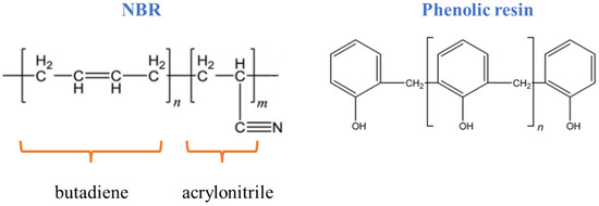 A mixture of phenolic resin and synthetic rubber has been used as a binder for friction materials of train vehicles’ frictional braking systems [9,10]. Through the use of such blends, one can create a polymeric binder having the qualities of both a hard thermosetting resin and flexible rubber. Nevertheless, broad use of this combination as a friction material binder is limited by the rubber phase’s inferior temperature stability when compared to phenolic resin [11,12,13].