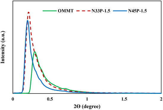 X-ray diffraction patterns of OMMT, N33P-1.5, and N45P-1.5.